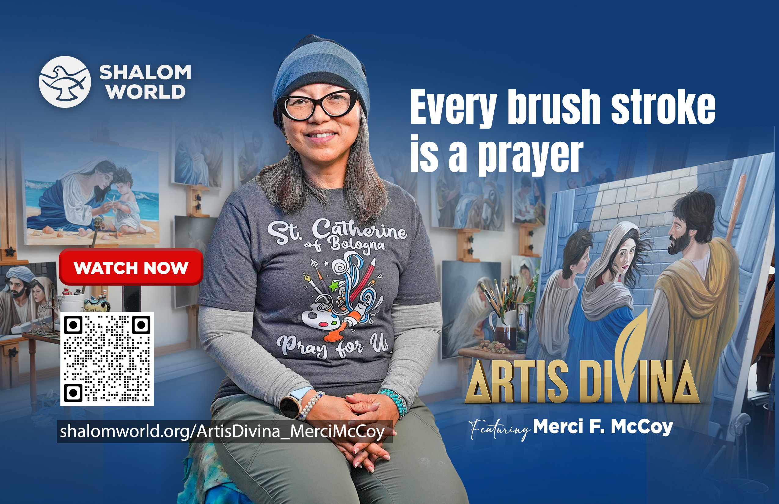 The Shalom World Artis Divina show is about artists who share their story about their inspired creations, faith journey and art rooted in faith. I am profoundly humbled and honored to be featured as one of the artists on Artis Divina. I am incredibly grateful to Shalom Media and all involved in bringing this to light. It truly is an answered prayer for my parents, † Lloyd and † Mercedes Flores, who were unceasing in their prayers for Mother Mary’s intercessions for me.