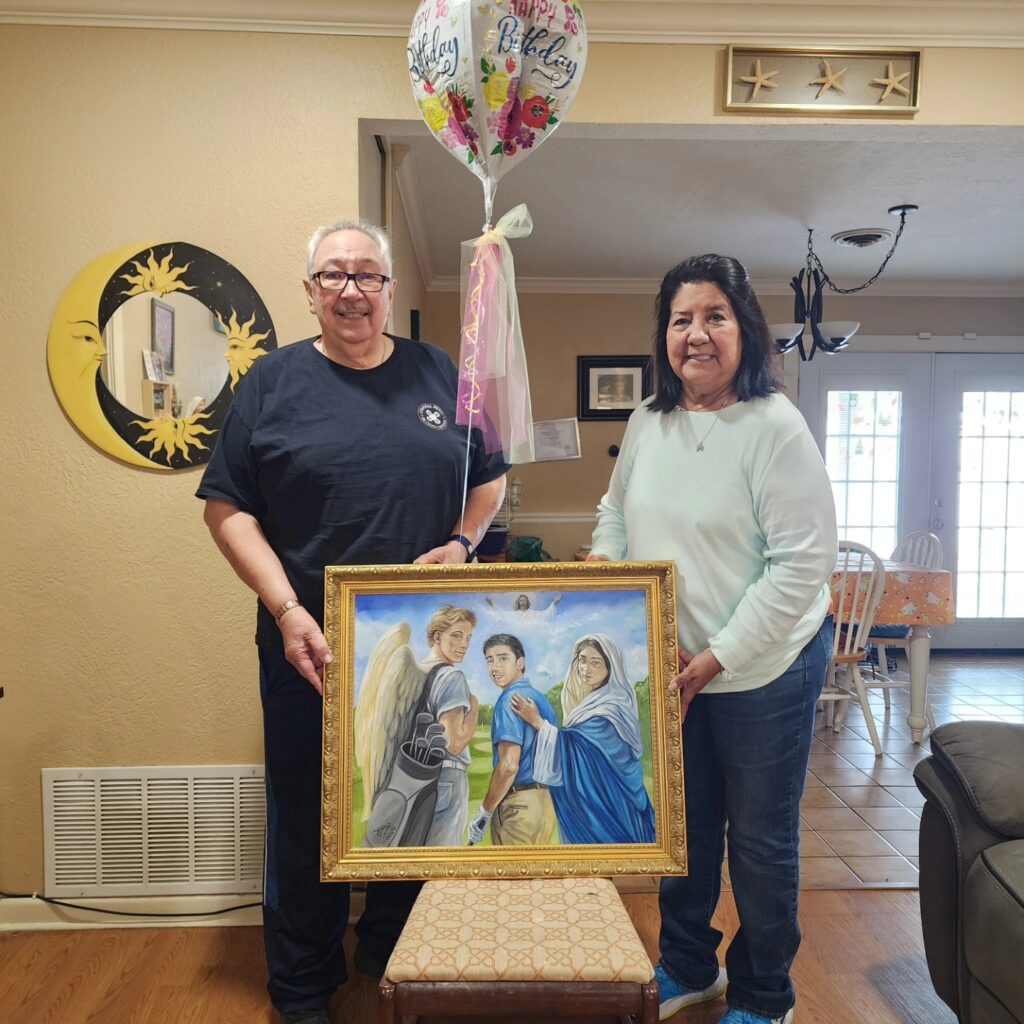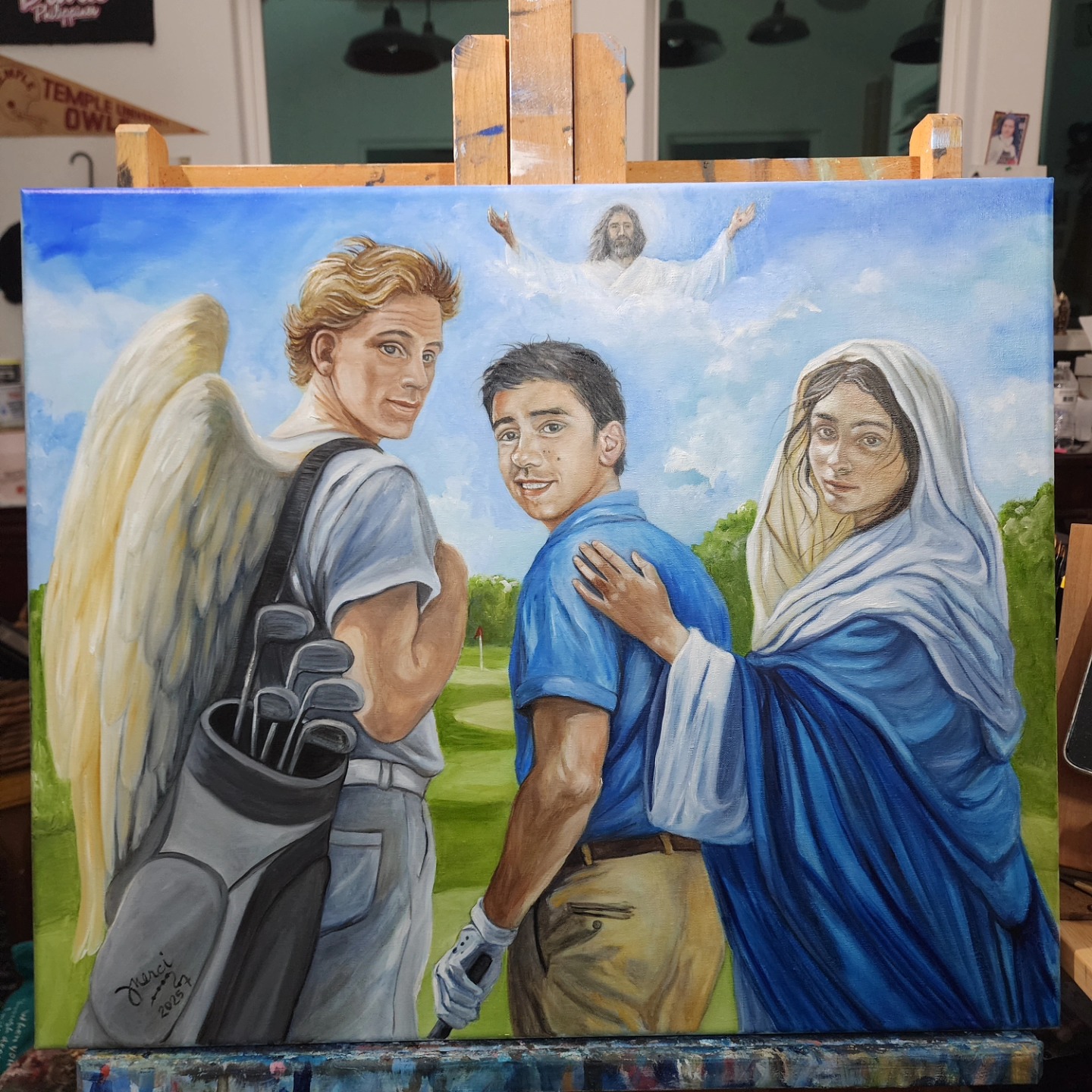 I had the privilege to create a memorial painting for the Salinas family who lost their 35 year-old son, Phillip, in a tragic car crash last year. After Adoration and a Holy Spirit-filled conversation with a sister-in-Christ, this painting emerged with a beautiful message from our Mother Mary for them and for all of us, too. It was a tremendous blessing to witness joyful tears when I delivered it today.