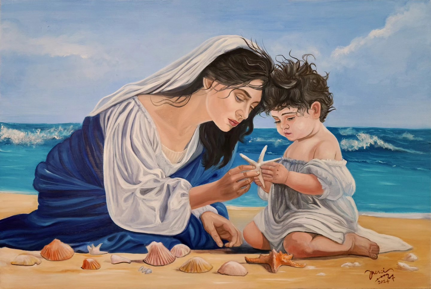I learned that starfish not only represents Mother Mary but also represents the 5 wounds of Christ. Stella Maris is a beautiful title given to our Blessed Virgin Mary and the title of this painting. However, I also wanted to capture another one of her titles, Mary, Seat of Wisdom, as she shares with the God of the universe the beauty of his creation through a starfish on the beach.